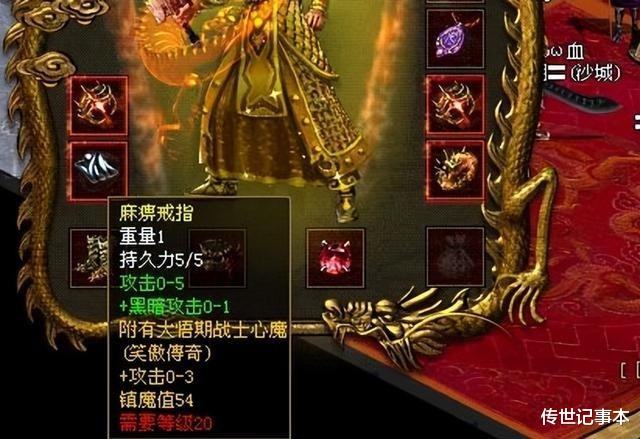魔帝的装备那叫一个极品,尤其是那枚攻5的麻痹戒指,简直就是传世界的镇服之宝。那年头连攻1的麻痹都算极品了,更别说攻5的存在。这套装备配上他的实力,整个百区基本上就成了他的后花园,想打架都找不到对手。